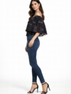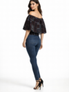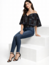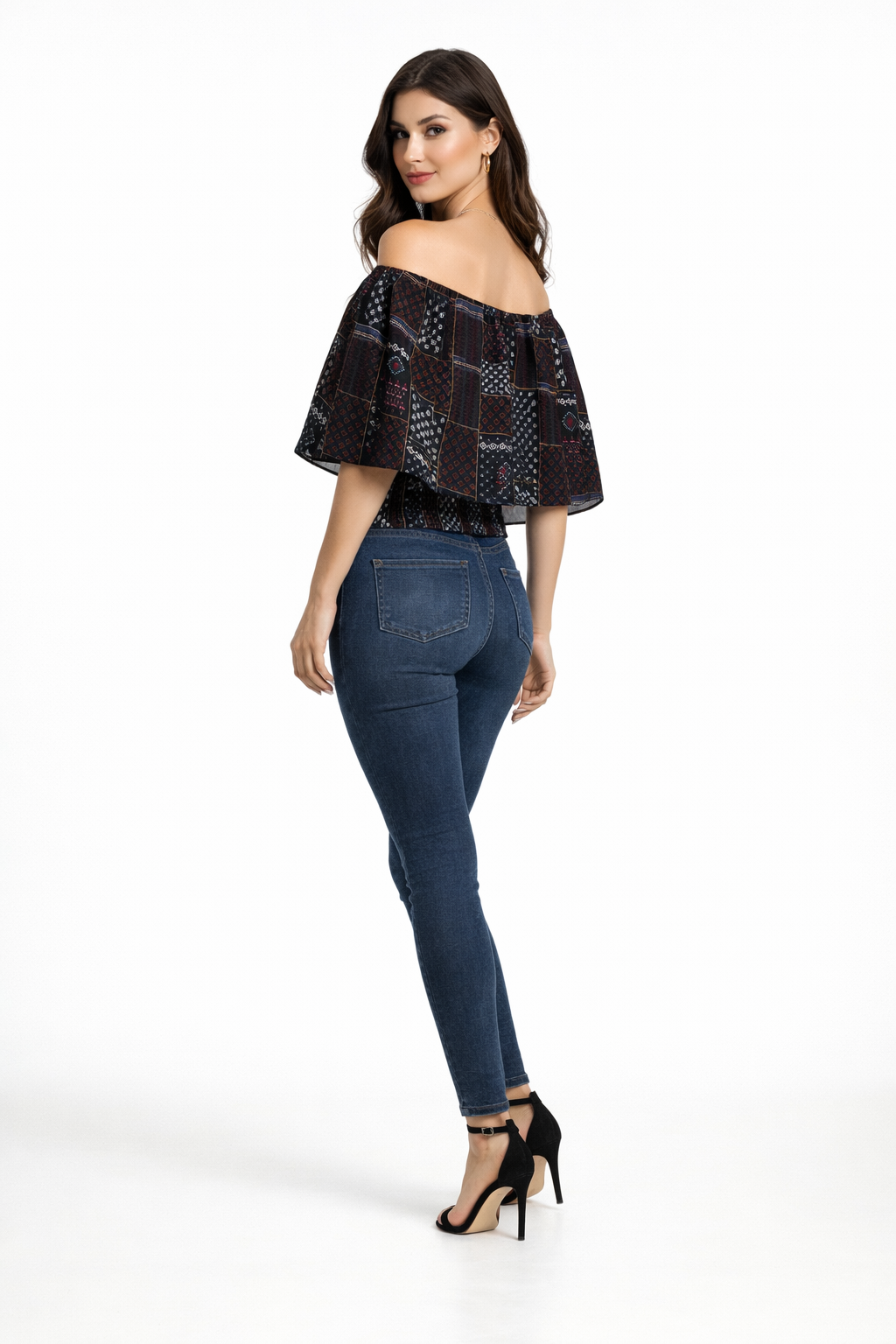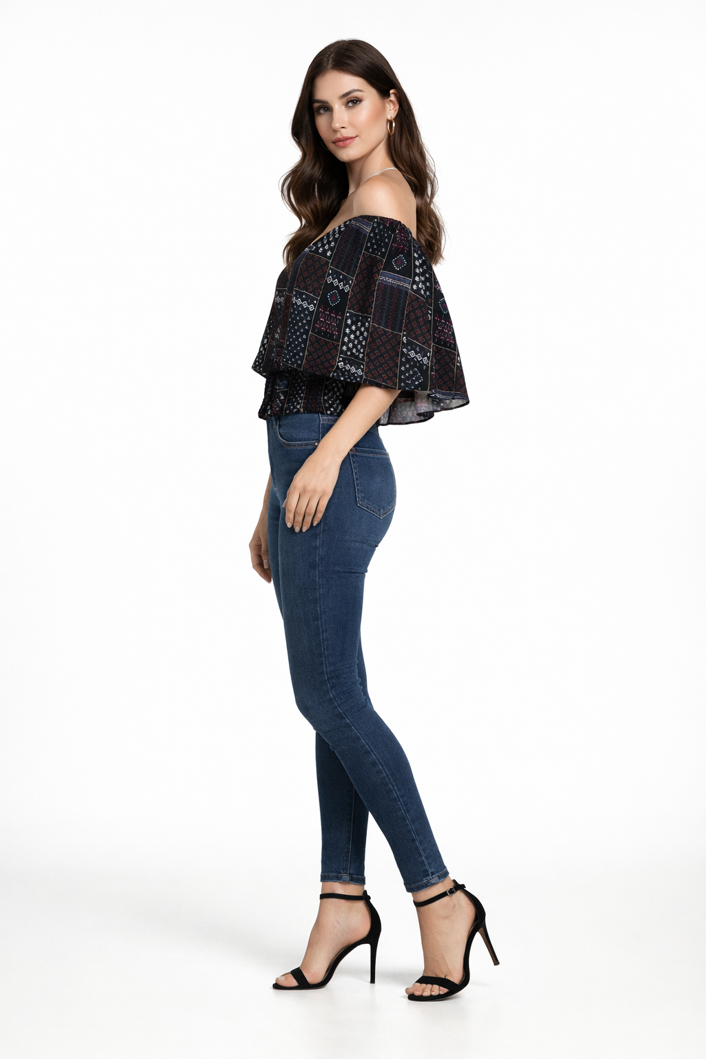 Elegant black chiffon off-shoulder top with patchwork print for stylish party wear.