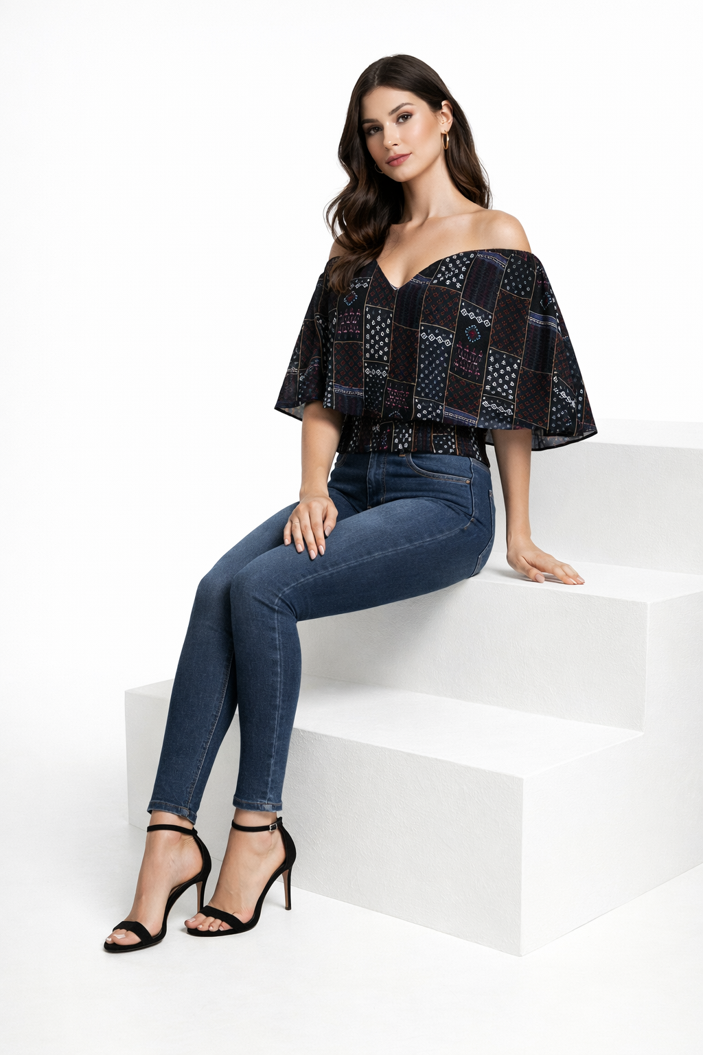 The top features a unique patchwork-inspired geometric print that enhances its modern appeal. The off-shoulder neckline creates a flattering silhouette, while the cape-style layered sleeves add movement and elegance.