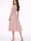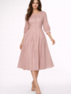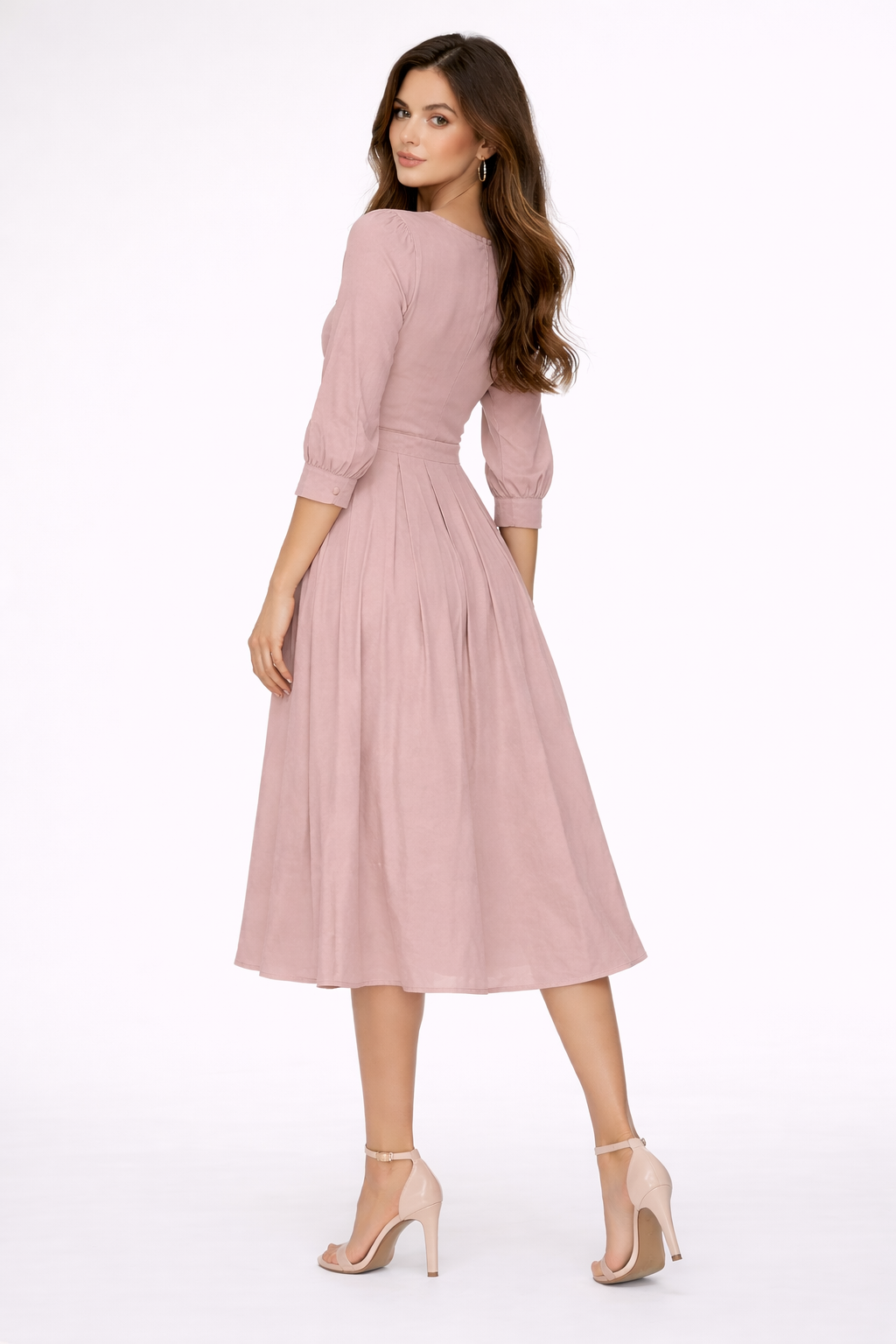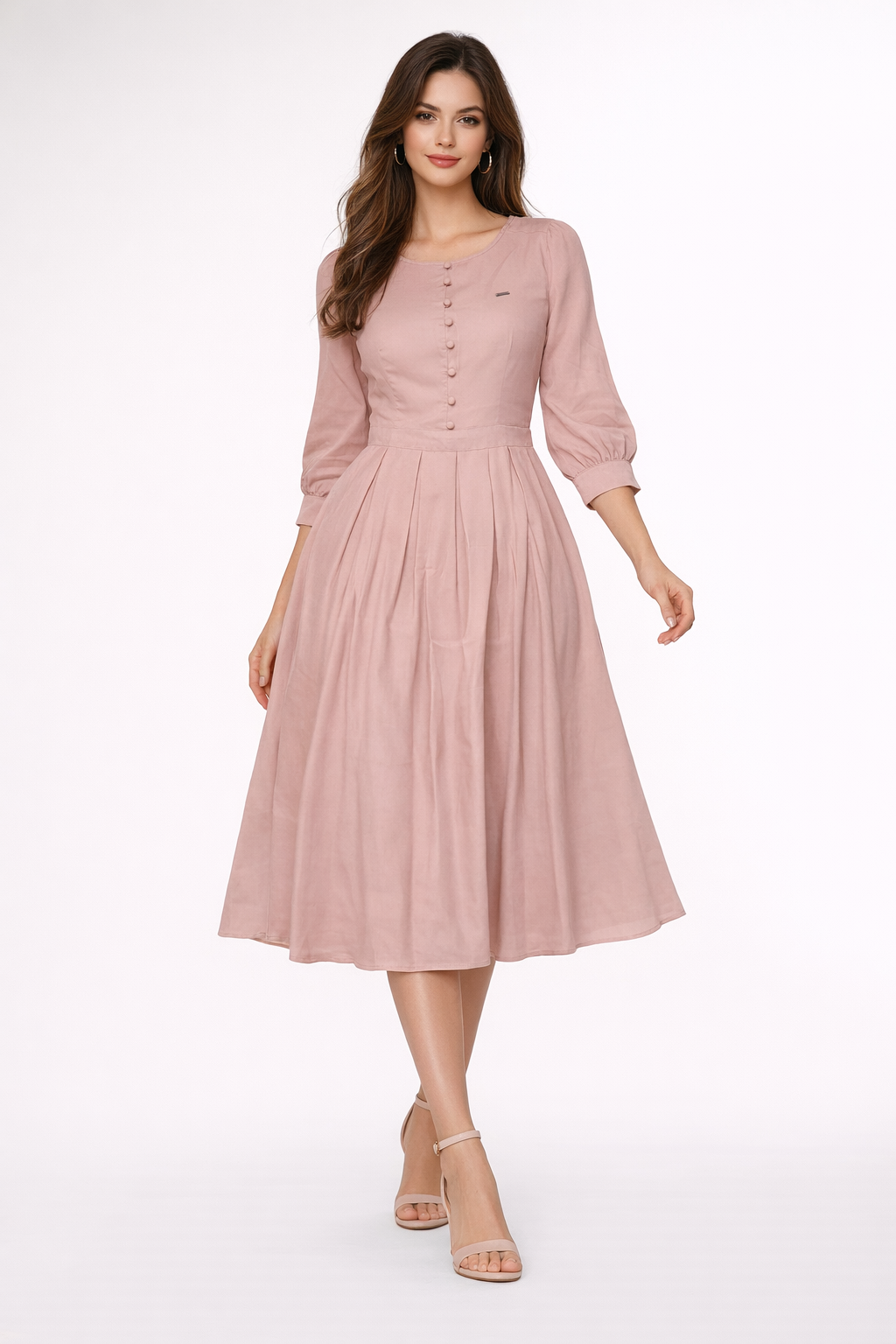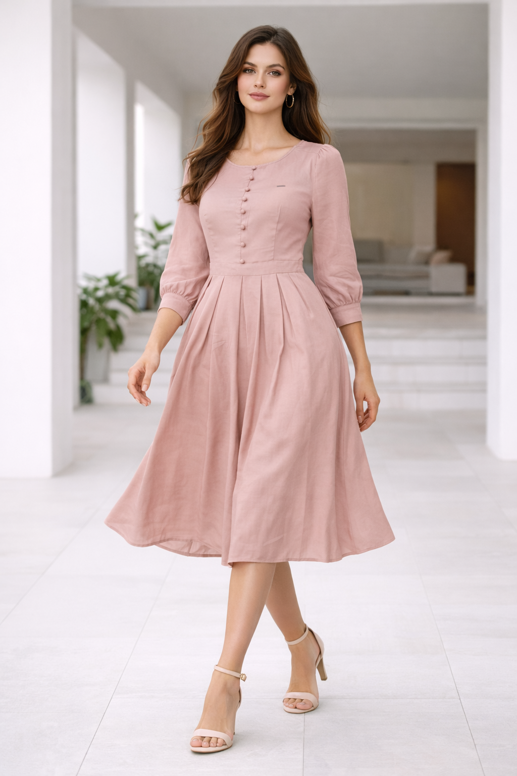 Elegant blush pink midi dress crafted from premium imported fabric, featuring a fitted bodice with front button detailing and a gracefully flared skirt for a timeless feminine silhouette. Perfect for formal occasions, brunch outings, and evening wear.