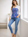The top features intricate stripe and ethnic print detailing that adds a unique and artistic appeal. The soft V-neckline with front button placket enhances the design while maintaining a relaxed silhouette.