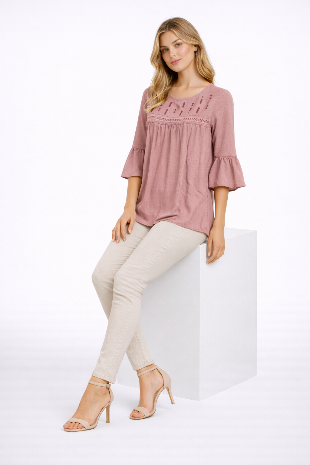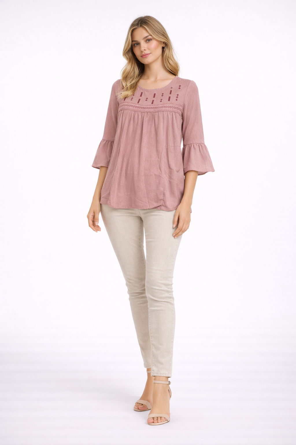 Elegant dusty pink rayon top featuring delicate embroidered detailing on the yoke with soft pleats and flared sleeves. Designed for a graceful, feminine everyday look.