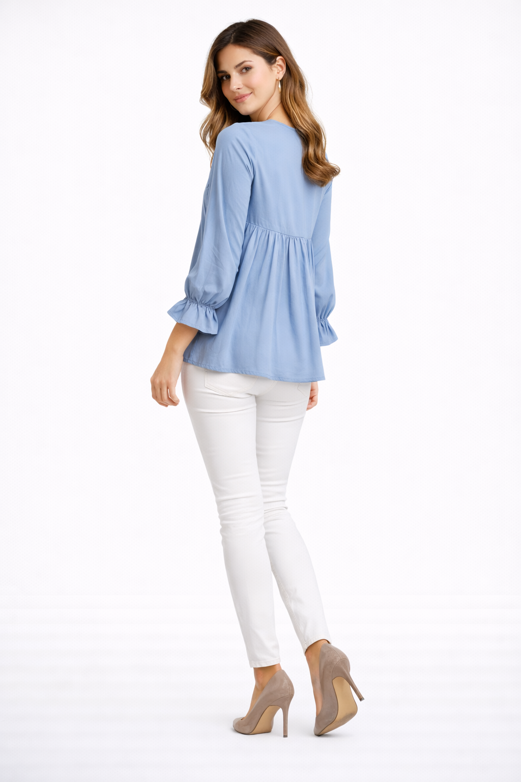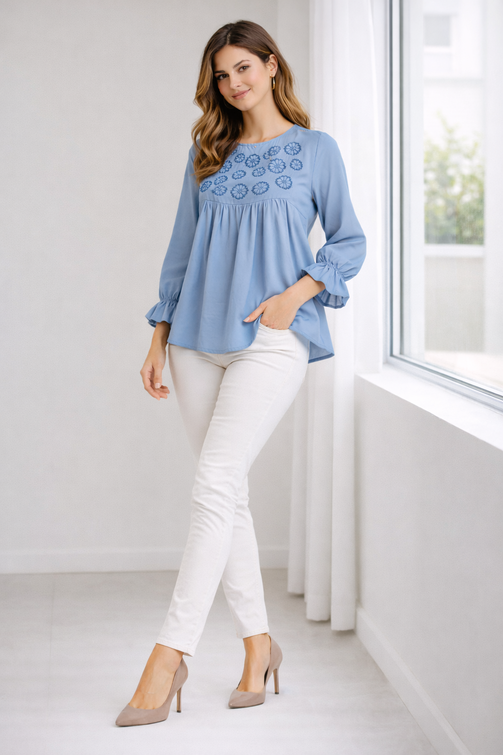 The delicately embroidered yoke adds a refined feminine touch to this rayon peplum top, giving it a stylish yet comfortable look. Easy to pair with jeans, trousers, skirts, or casual bottoms, this top is designed to create elegant everyday outfits that combine comfort, style, and modern simplicity.
