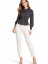This stylish top features a delicate all-over mini floral print that adds subtle feminine charm. The highlight of the design is the semi-sheer lace-detailed yoke panel that creates a refined and graceful look. The classic collared neckline with button detail enhances the structured appearance while maintaining a polished aesthetic.