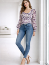 This beautiful top features a delicate lavender abstract floral print that adds a subtle feminine charm. The round neckline is enhanced with ruffle detailing and a decorative pendant accent, giving it a refined and elegant touch.