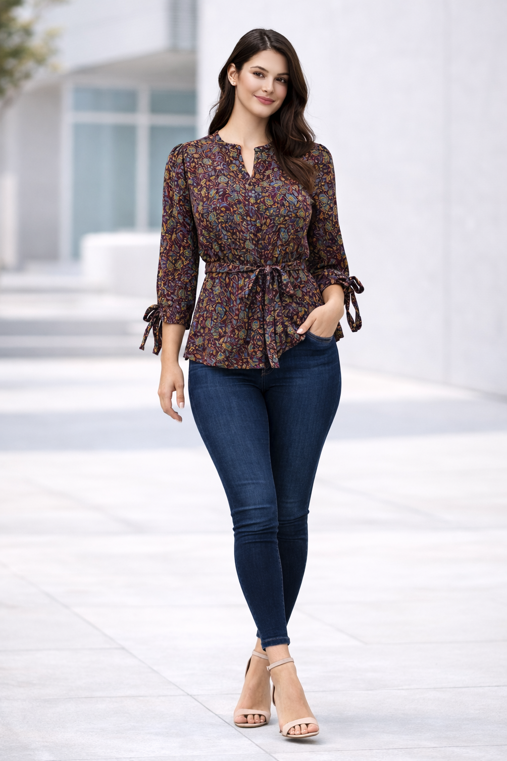 Elegant floral printed top designed with a flattering waist tie and stylish sleeve tie details. Perfect for casual outings, office wear, and smart everyday styling.