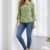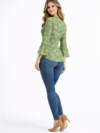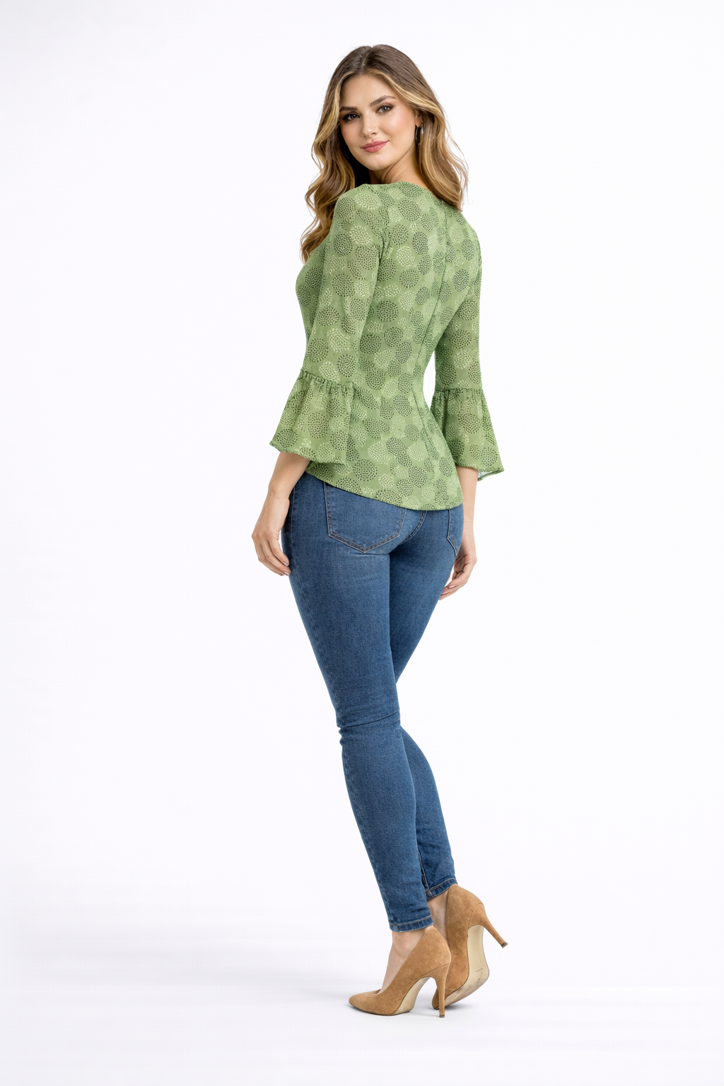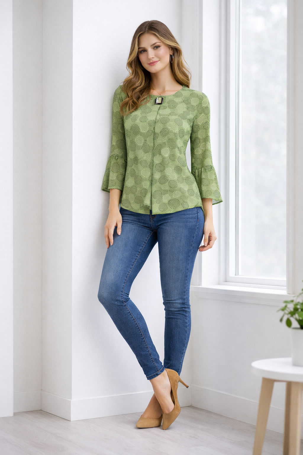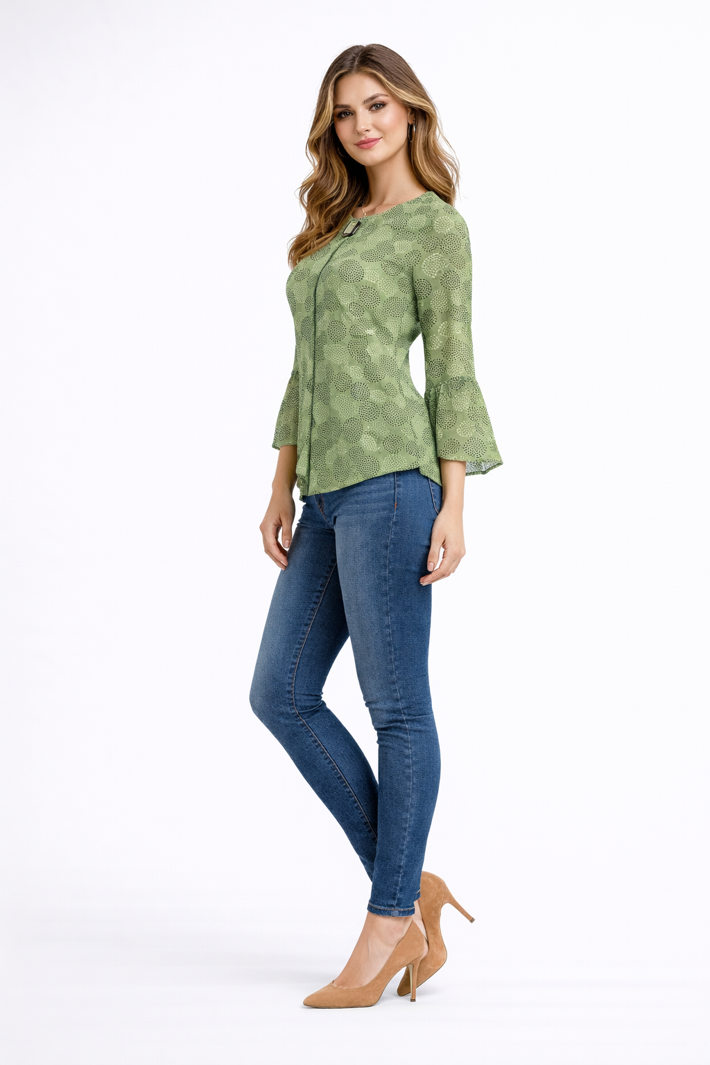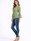 This top features an all-over abstract circular print in a beautiful olive green tone that adds a unique and trendy visual appeal. The round neckline creates a clean and classic look, while the elegant three-quarter bell sleeves bring a stylish and feminine touch to the design.