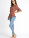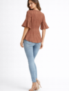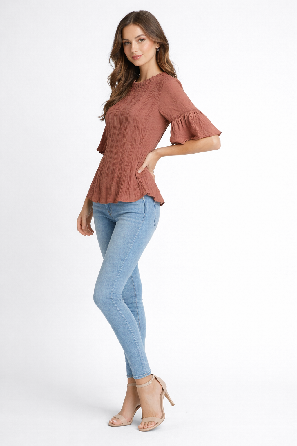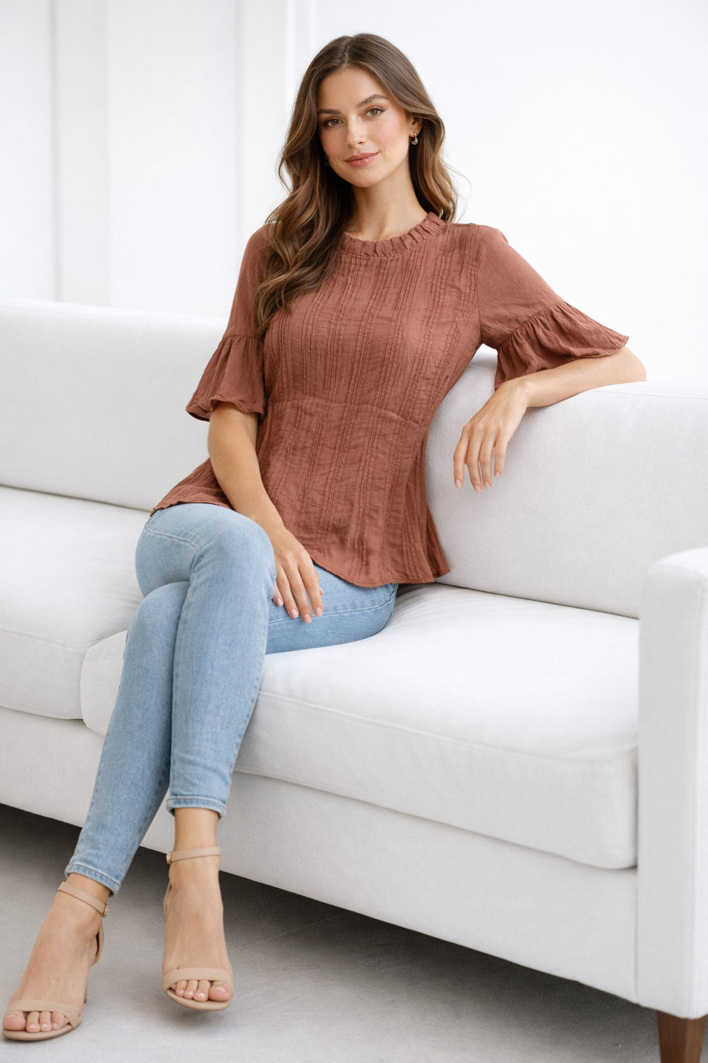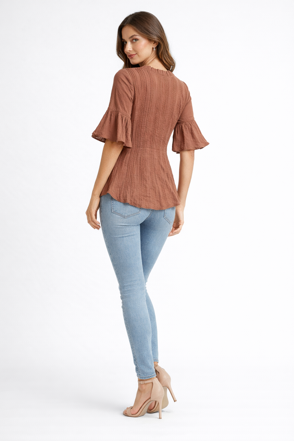 Rustic Brown Textured Georgette Ruffle Sleeve Top