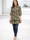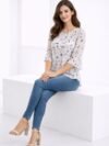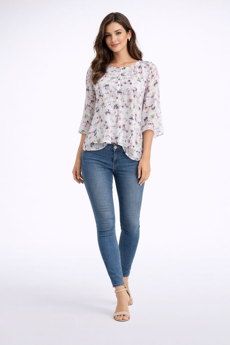 The round neckline with front button detailing creates a refined look, while the three-quarter flowy sleeves provide comfort and graceful movement. Its relaxed fit ensures ease of wear for both casual wear and office wear.