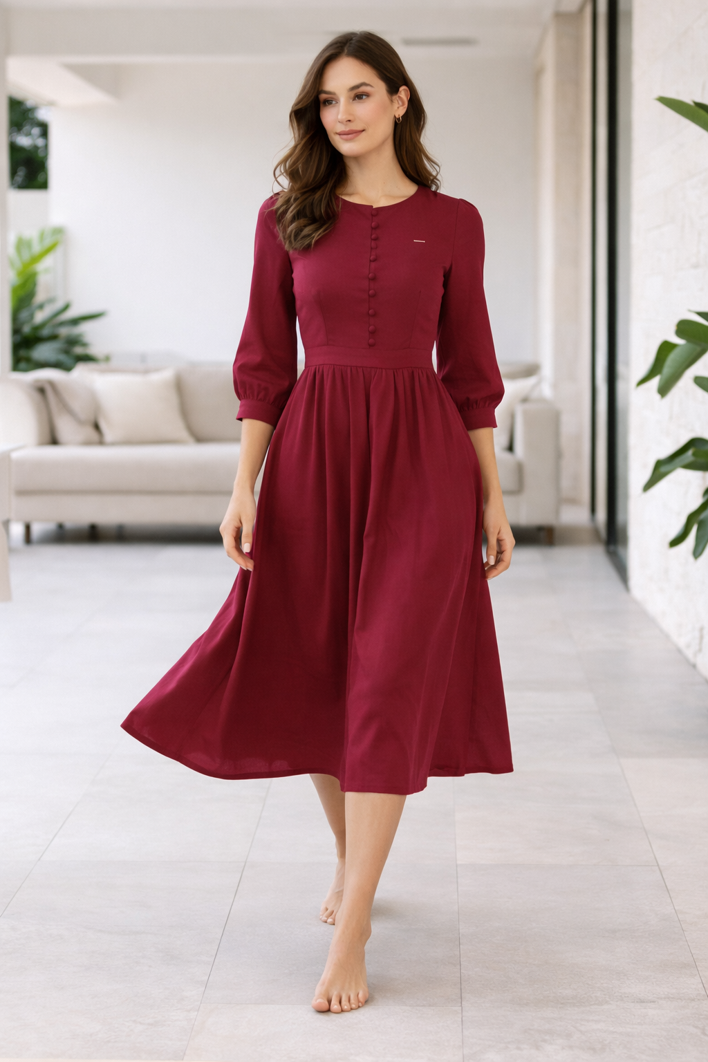 Elegant wine red midi dress crafted from premium imported fabric, featuring a structured bodice with front button detailing and a beautifully flared skirt. Perfect for festive occasions, formal gatherings, and evening wear.