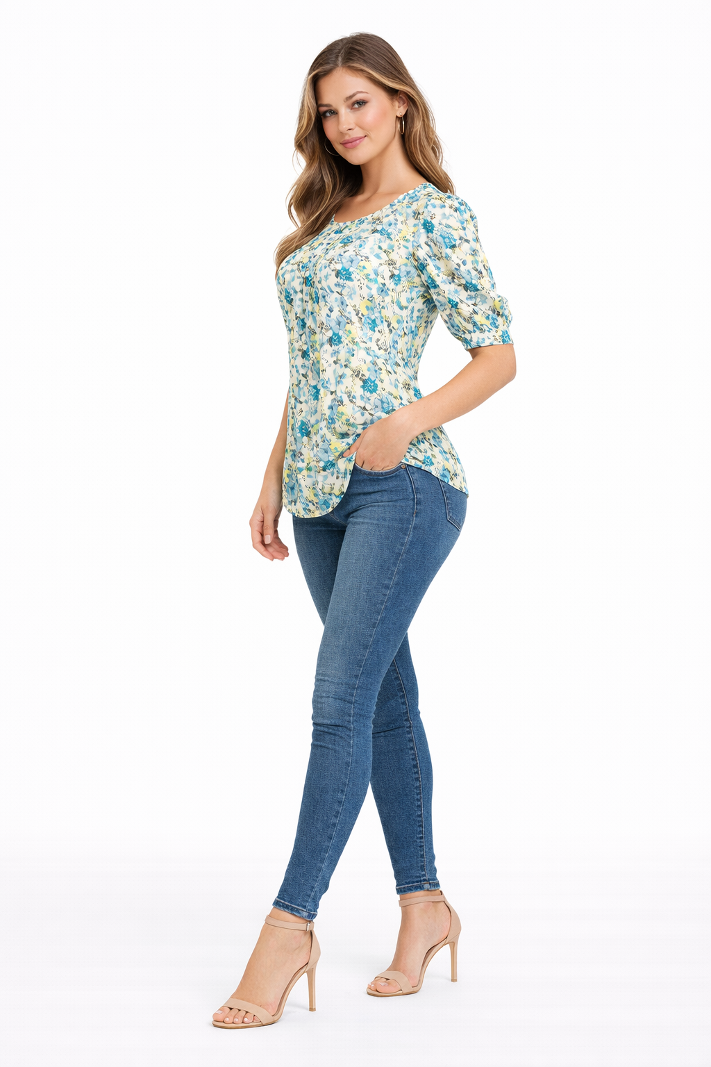 The soft round neckline and relaxed silhouette offer ease of wear, while the delicate floral print enhances its feminine appeal. The short puff sleeves add a modern and flattering touch, making it a standout piece in stylish women fashion.