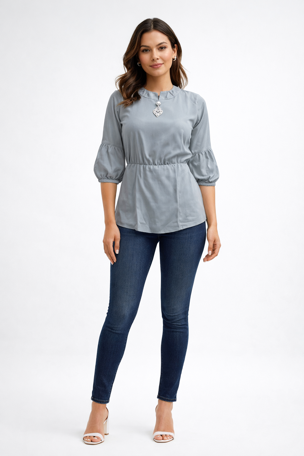 - Sleeves: Three-quarter puff sleeves with elastic cuff