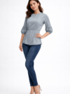 The top features a soft grey tone that adds versatility to your styling options. The round neckline and gathered waist detailing enhance the silhouette, creating a flattering and feminine look.