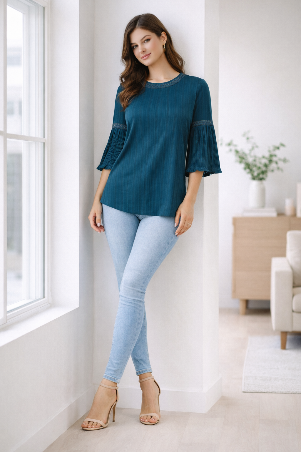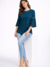 The subtle textured detailing and embellished neckline add a sophisticated touch, while the pleated bell sleeves create graceful movement. Ideal for casual wear and office wear.