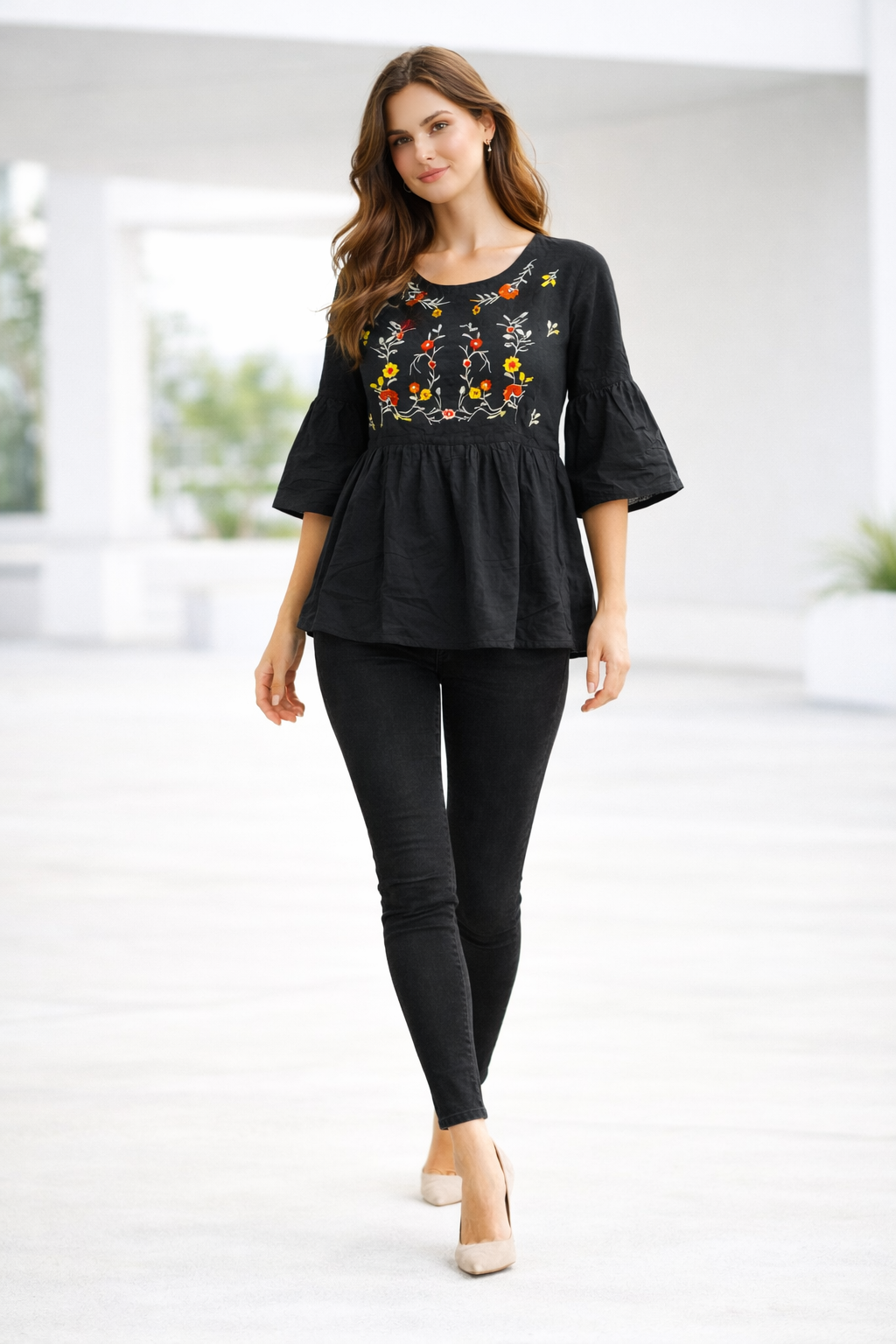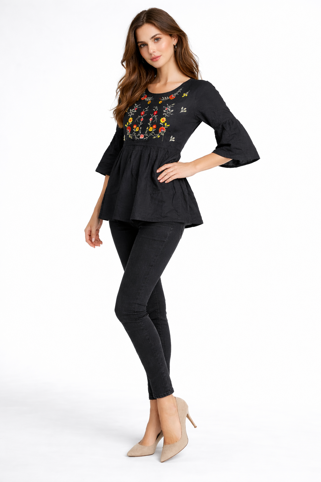 The floral embroidery on the yoke adds vibrant charm, while the peplum silhouette enhances the waistline. The bell sleeves add a graceful touch, making it ideal for casual wear and festive styling.