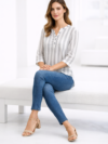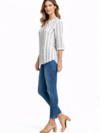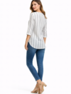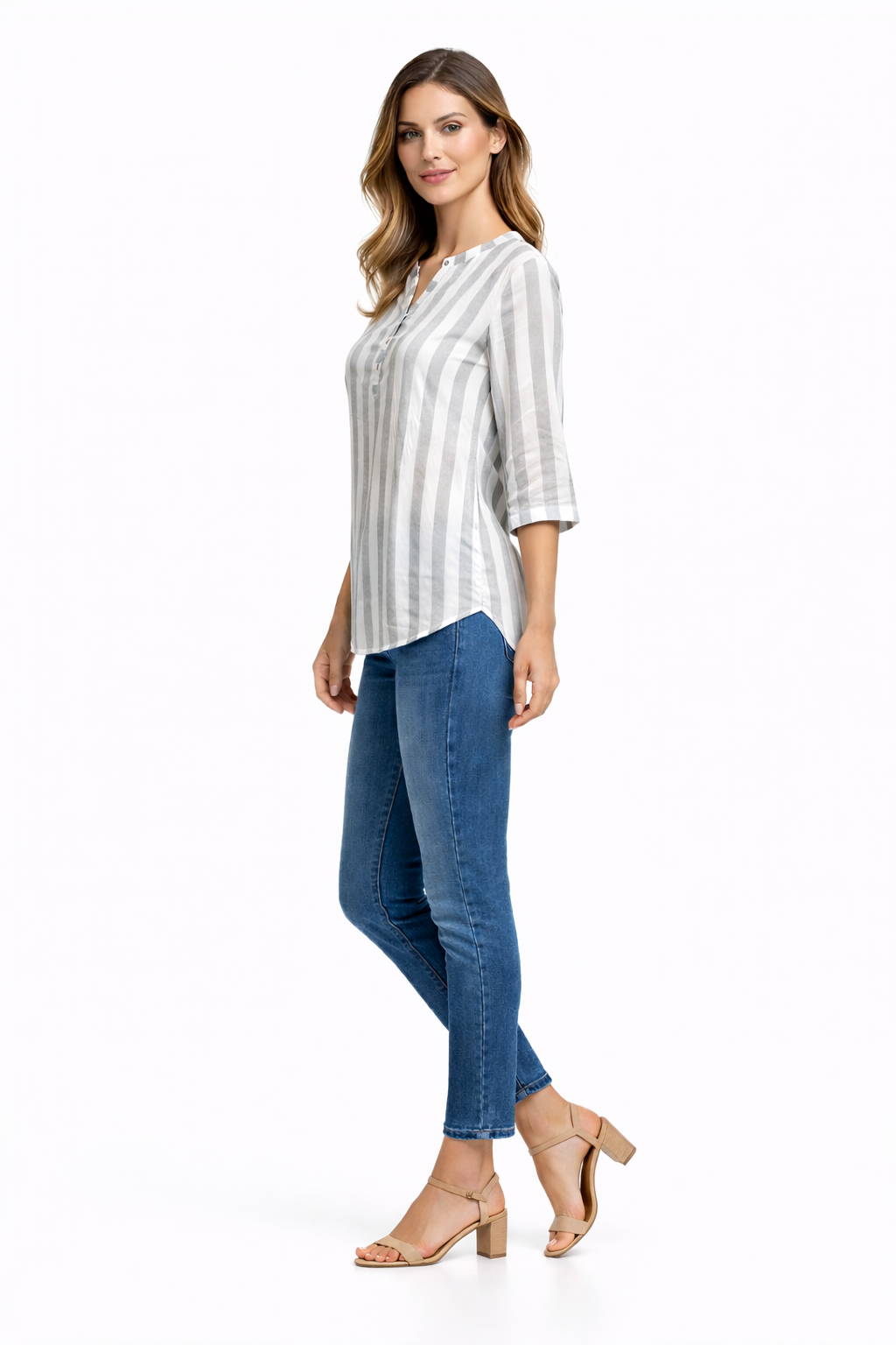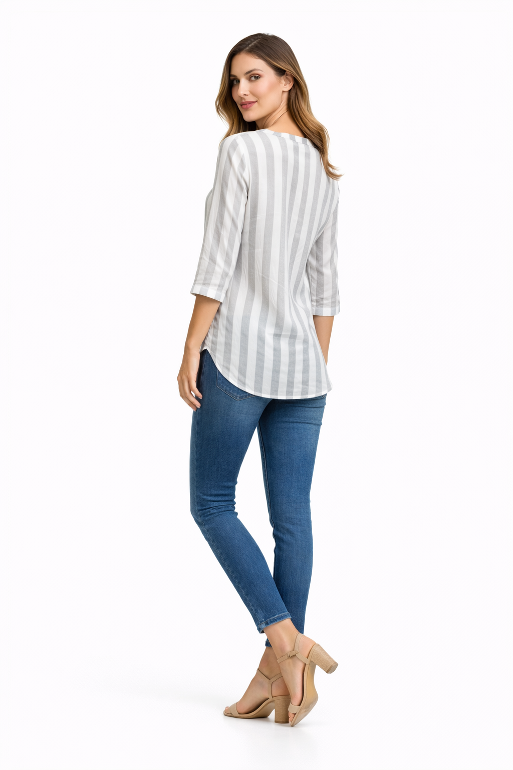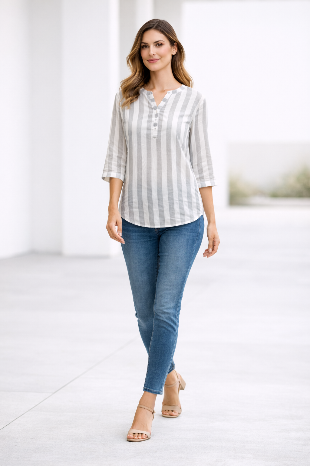 The notch neckline with button detailing enhances its modern appeal, while the vertical stripes create a flattering silhouette that complements all body types.