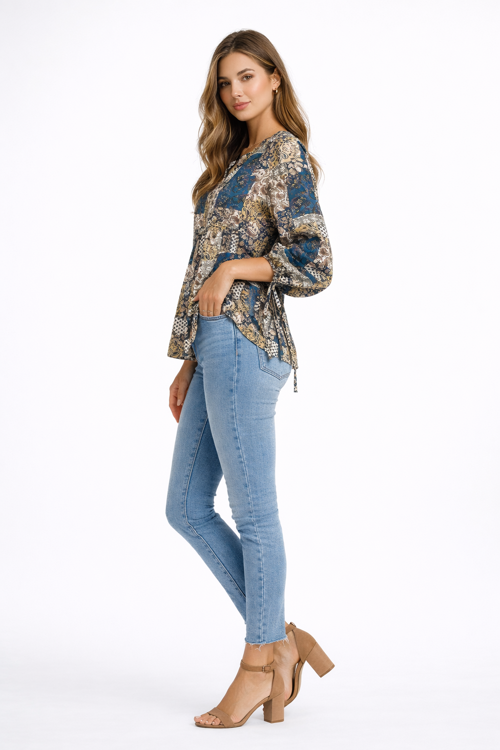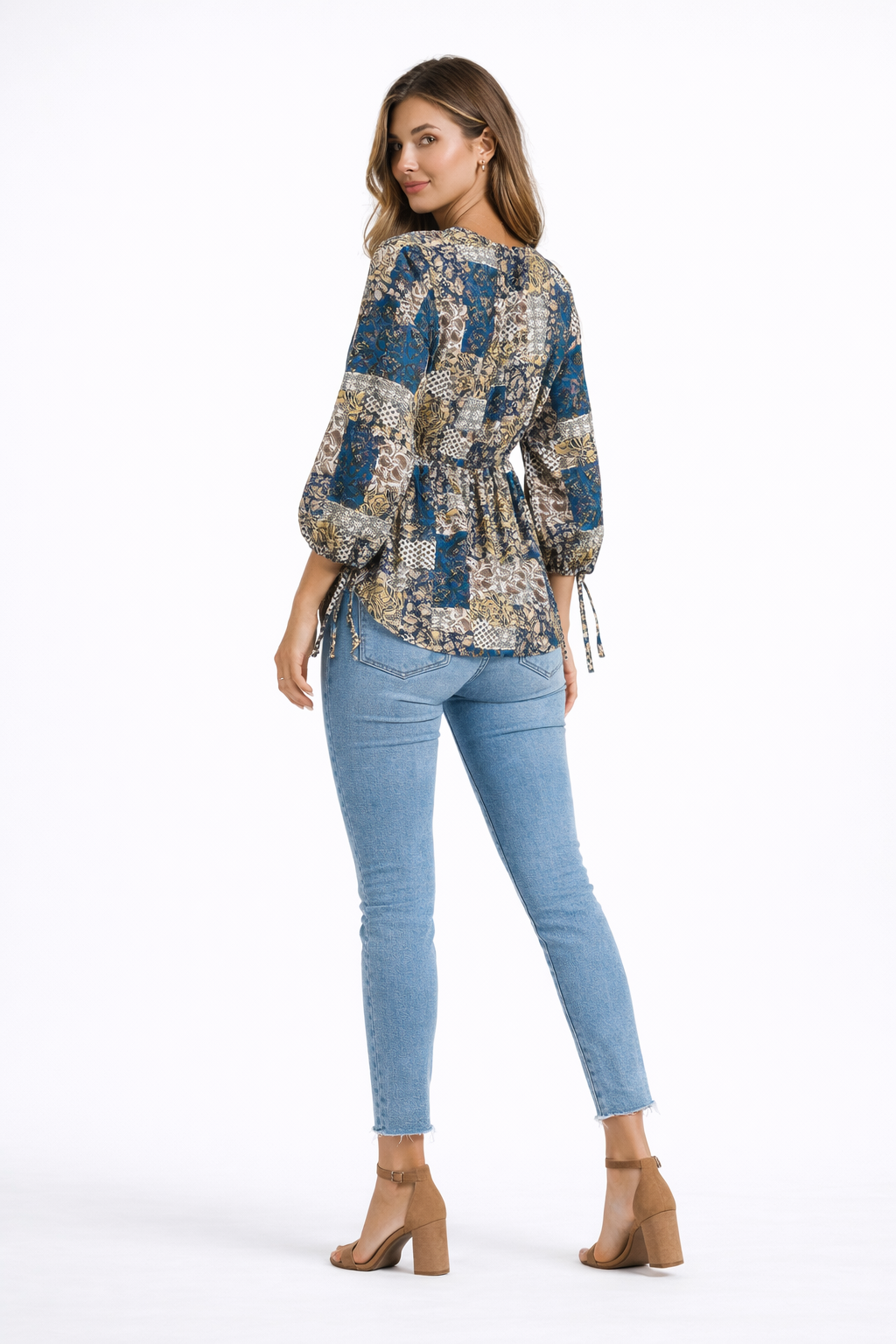 The patchwork print adds a unique touch, while the V-slit neckline enhances its modern look. The balloon sleeves provide a trendy silhouette, making it perfect for casual wear and office wear.