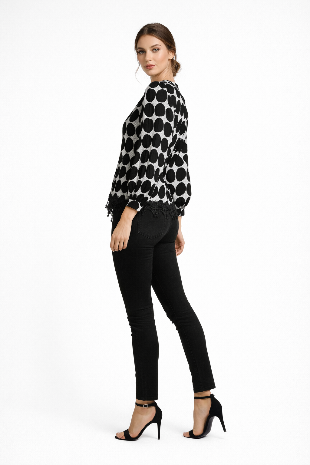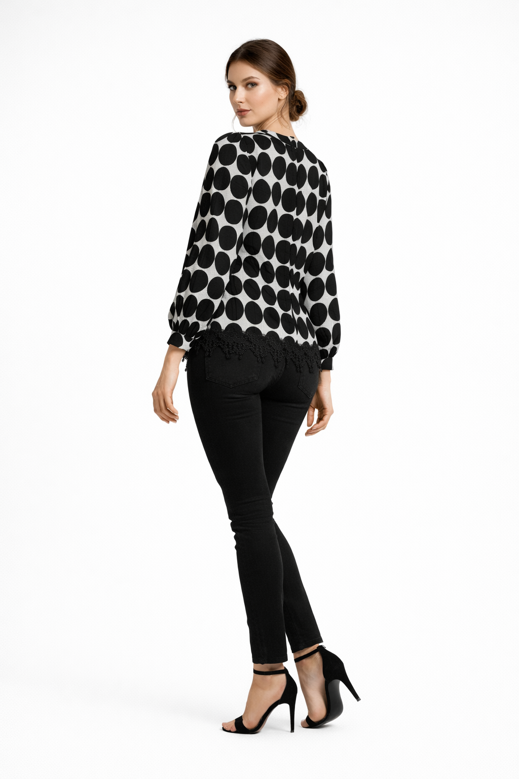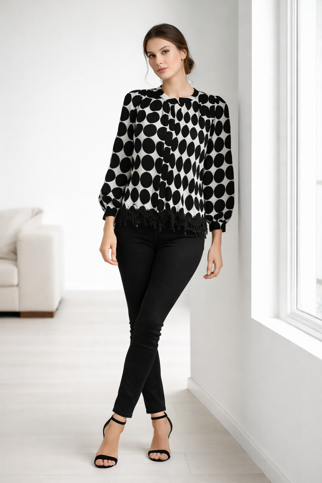 The polka dot print adds a playful yet refined look, while the lace hem detailing enhances its feminine charm. Ideal for casual wear and office wear.