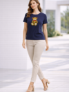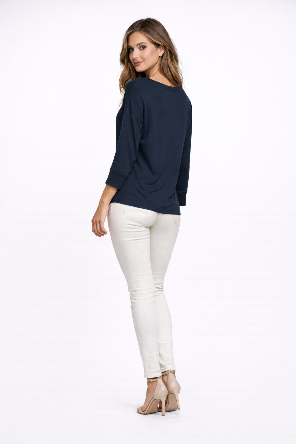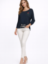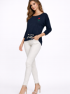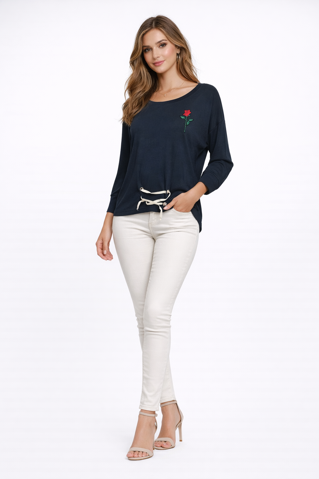 The top features a delicate rose embroidery on the front that adds a subtle yet elegant touch to your look. The round neckline offers a clean and timeless silhouette while the three-quarter sleeves provide a balanced combination of style and coverage. An adjustable drawstring hem at the front adds a modern detail while allowing you to customize the fit according to your preference.