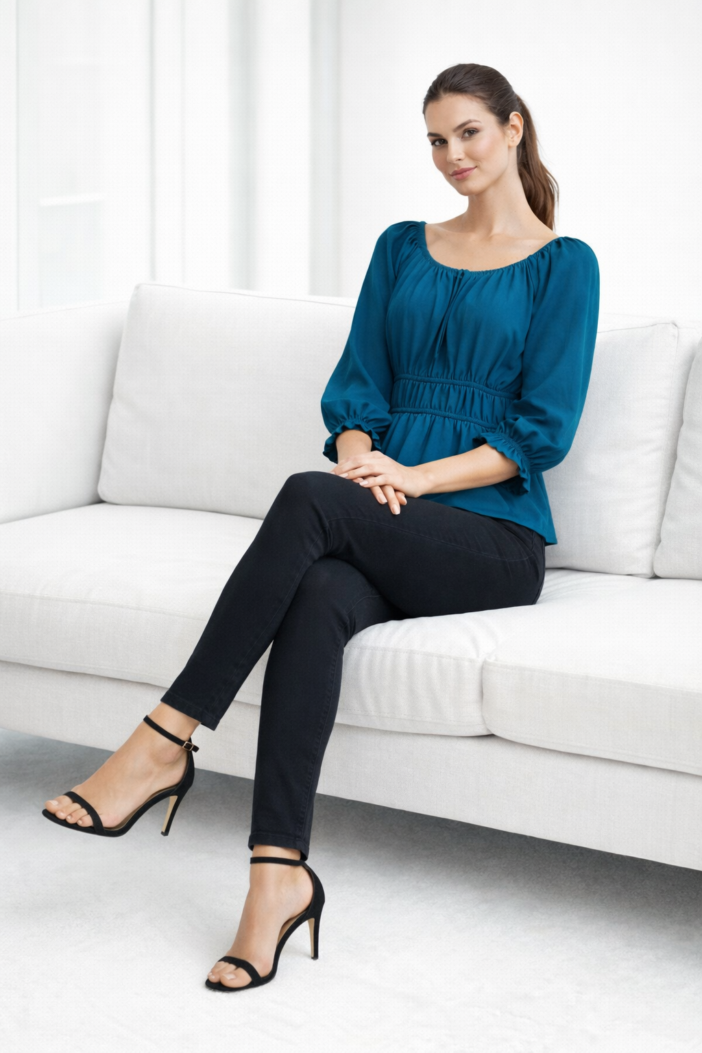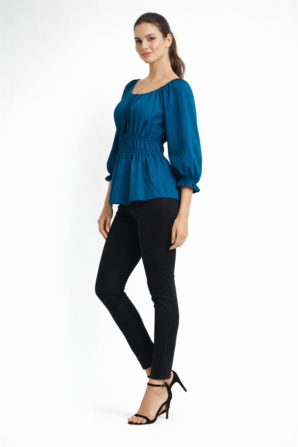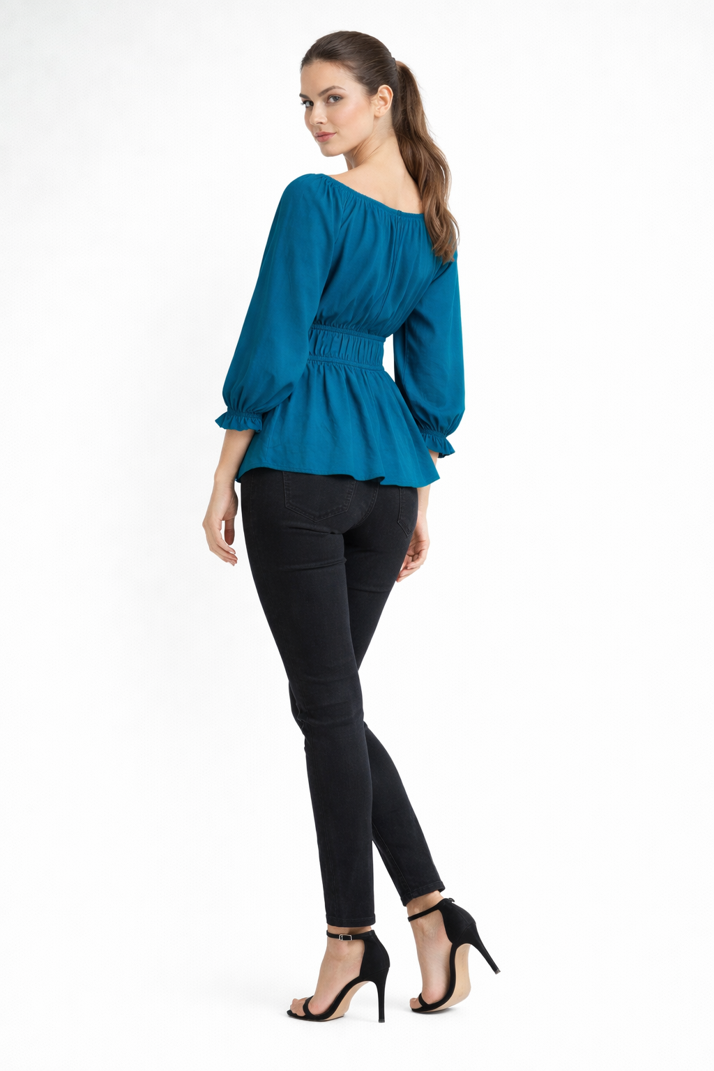 Turn heads with this teal off-shoulder top featuring an elastic neckline, smocked waist, and bishop sleeves, offering a flattering fit for casual outings and stylish everyday wear.