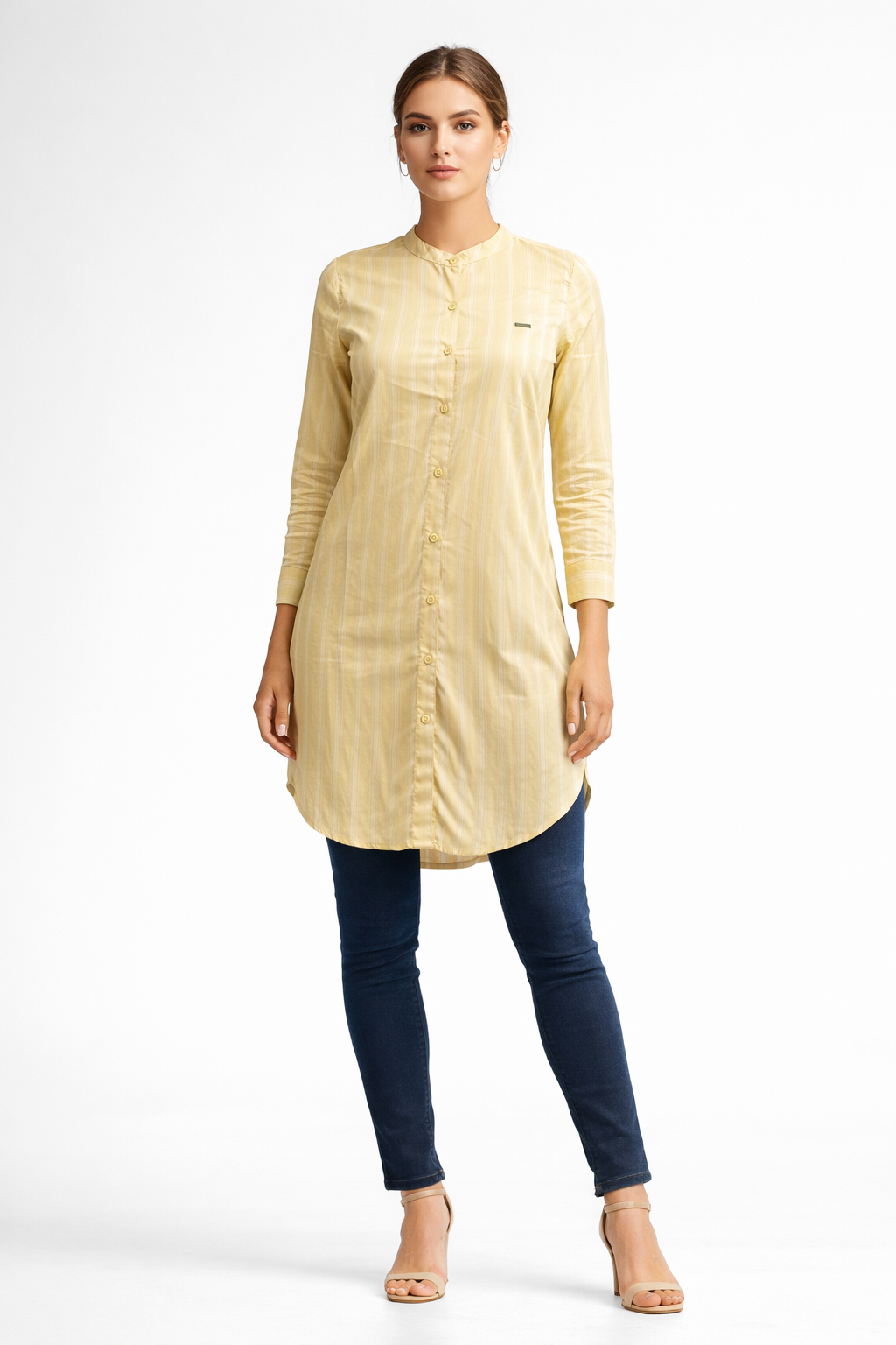 The band collar and button-down design enhance its modern appeal, while the vertical stripes create a flattering silhouette for everyday styling.