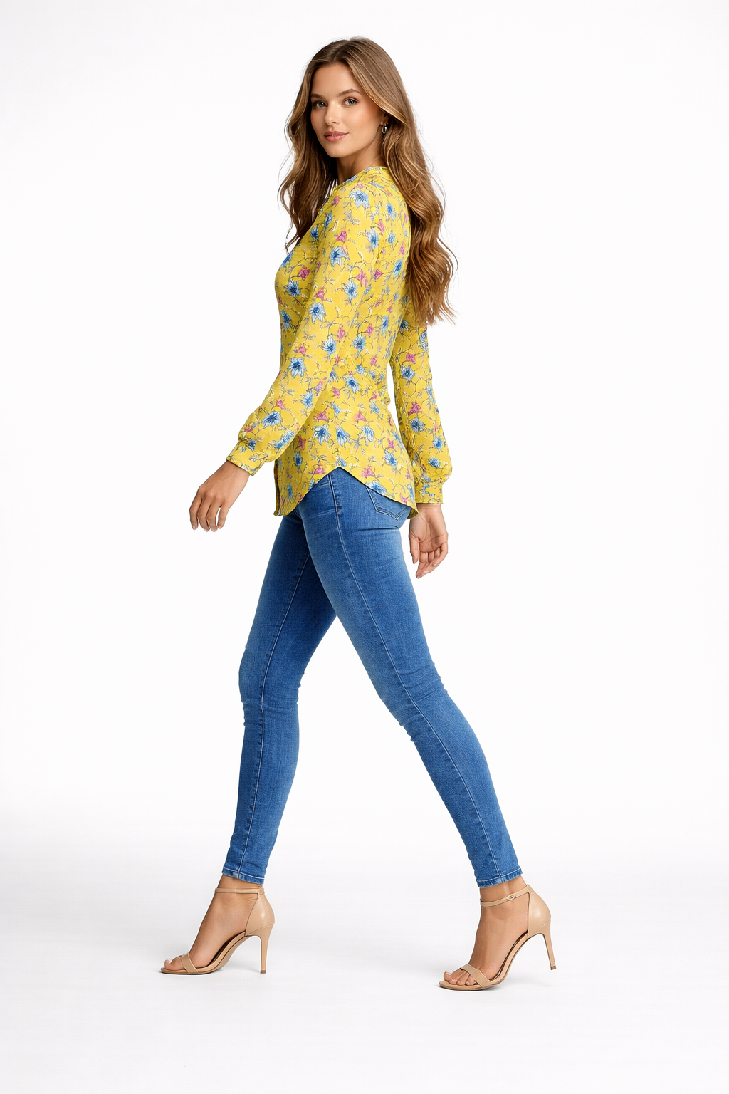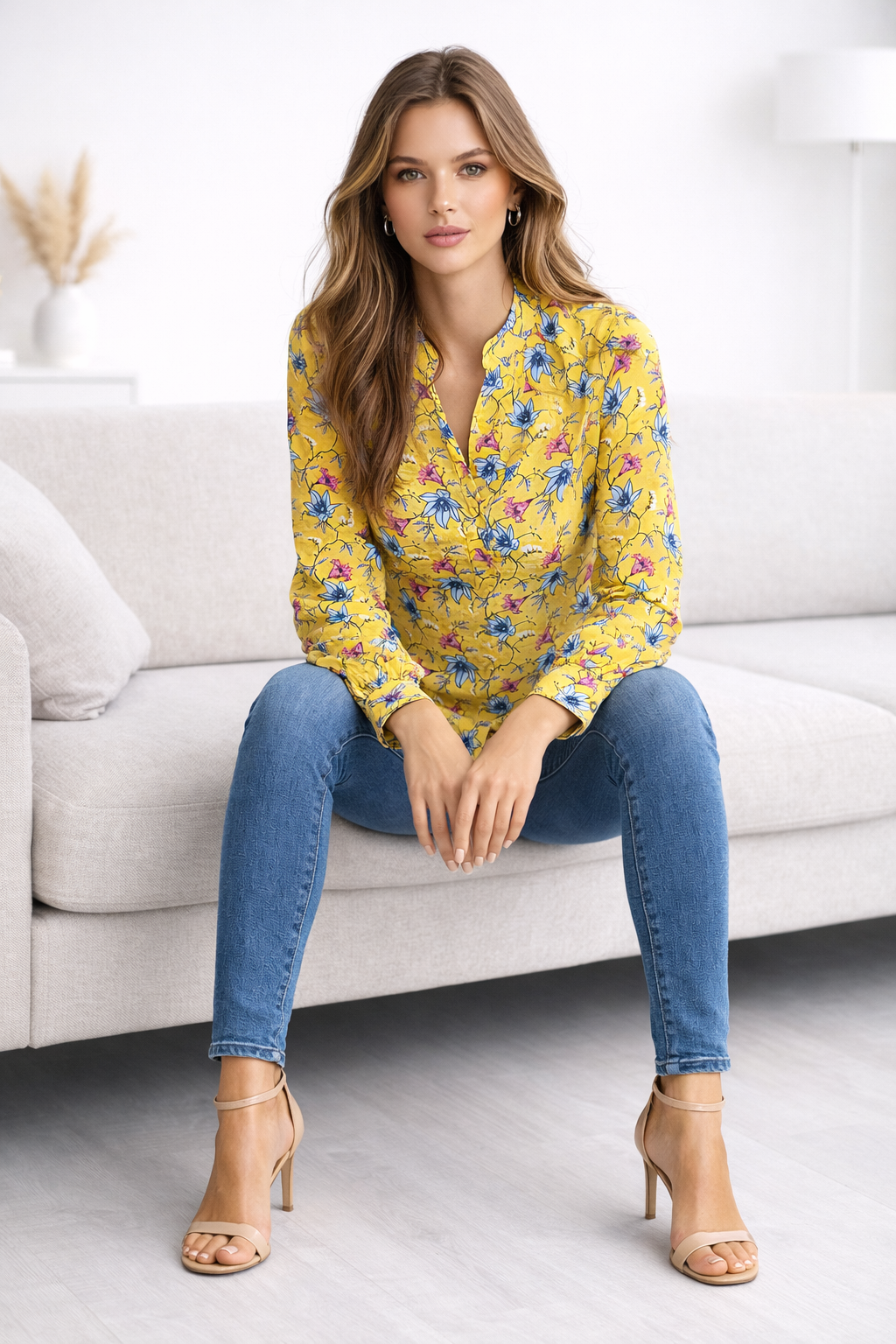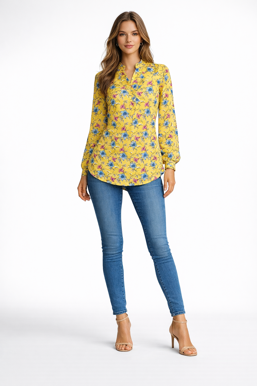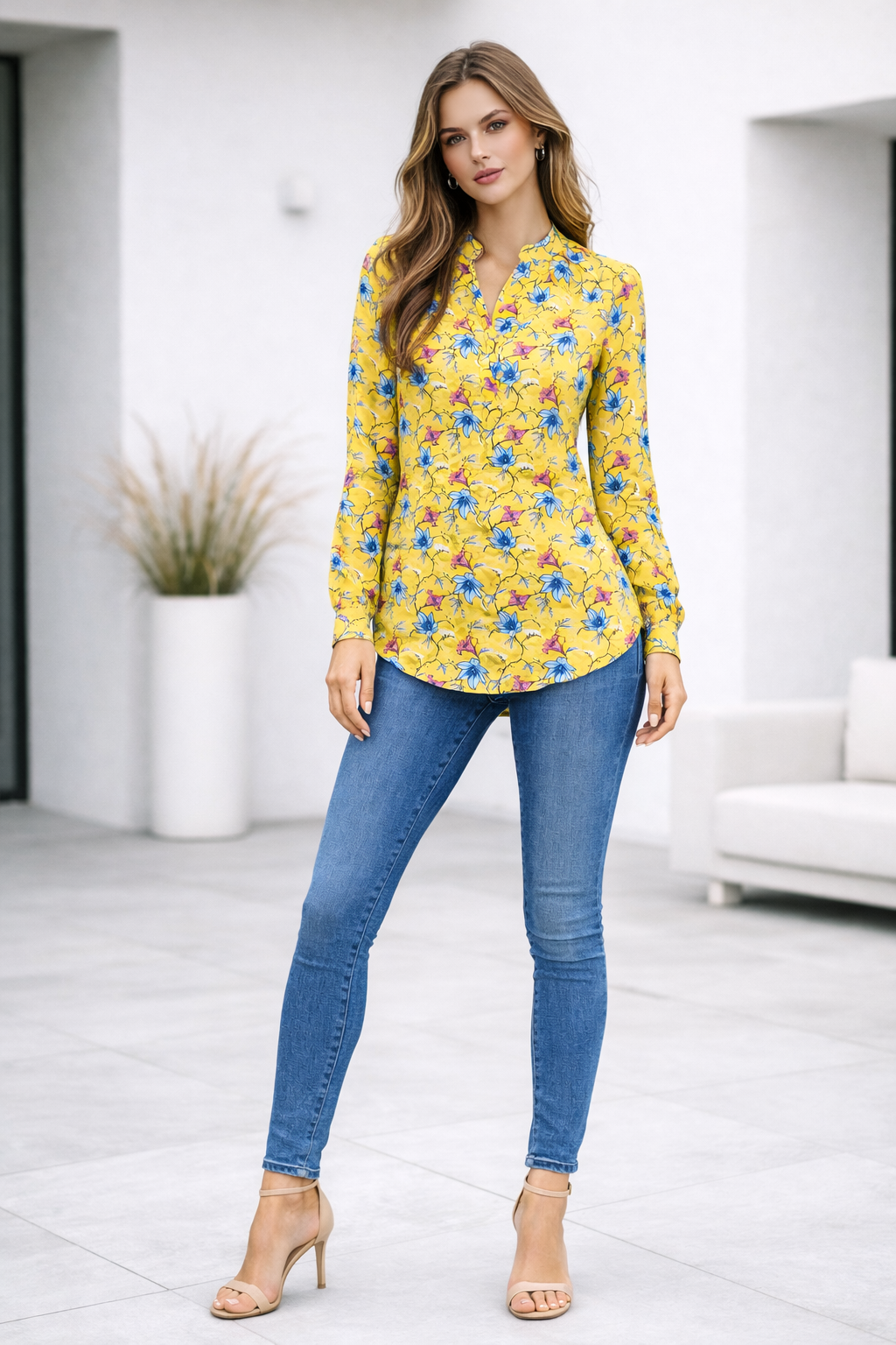 Bright yellow rayon shirt-style top featuring an all-over blue and pink floral print with a smart collar neckline and full sleeves. Perfect for casual outings, office wear, and everyday chic styling.